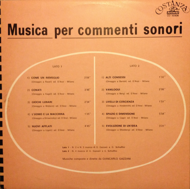 Giancarlo Gazzani released another LP titled Musica per comment sonori for Costanza Records, CO 10007, that contains eleven tracks.