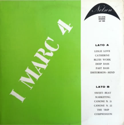 The fourth of at least ten albums with the same title, I Marc 4 (GLP 1005) on Italy’s Nelson Records features a dozen tracks including “Paperino soldato,” “Scarpe grosse,” “Giochi infantili,” “Giostra di periferia,” and “Suoni armonici” on the side one and “Sambasso,” “Happy Beat,” “Ray Ban,” “Chivas,” “Rum and Coke,” and “Asfalto in Agguato” on side two.