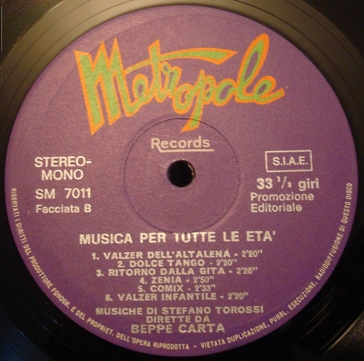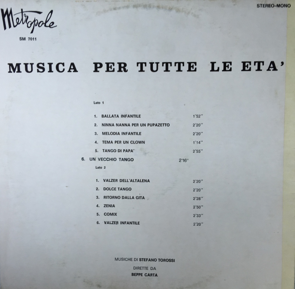 The first side of Musica per tutte le eta’ includes Stefano Torossi’s “Ballata infantile,” “Ninna nanna per un pupazetto,” “Melodia infantile,” “Tema per un clown,” “Tango di papa'” and “Un vecchio tango.” Like the other four albums Torossi did for Metropole, this album was only issued in Italy in very small numbers sometime in the early 1970s.