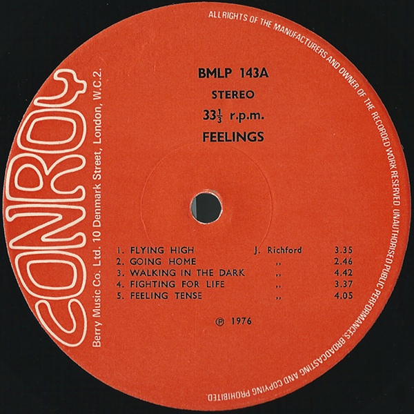 Besides the pair of Conroy Eurobeat compilations, the parent label reissued Feelings (BMLP 143) in 1976, the milestone library music album initially credited to Jay Richford and Gary Stevan that features the music of composers Sandro Brugnolini, Gancarlo Gazzani, Puccio Roelens, and Stefano Torossi and was initially released by Carosello in 1974.