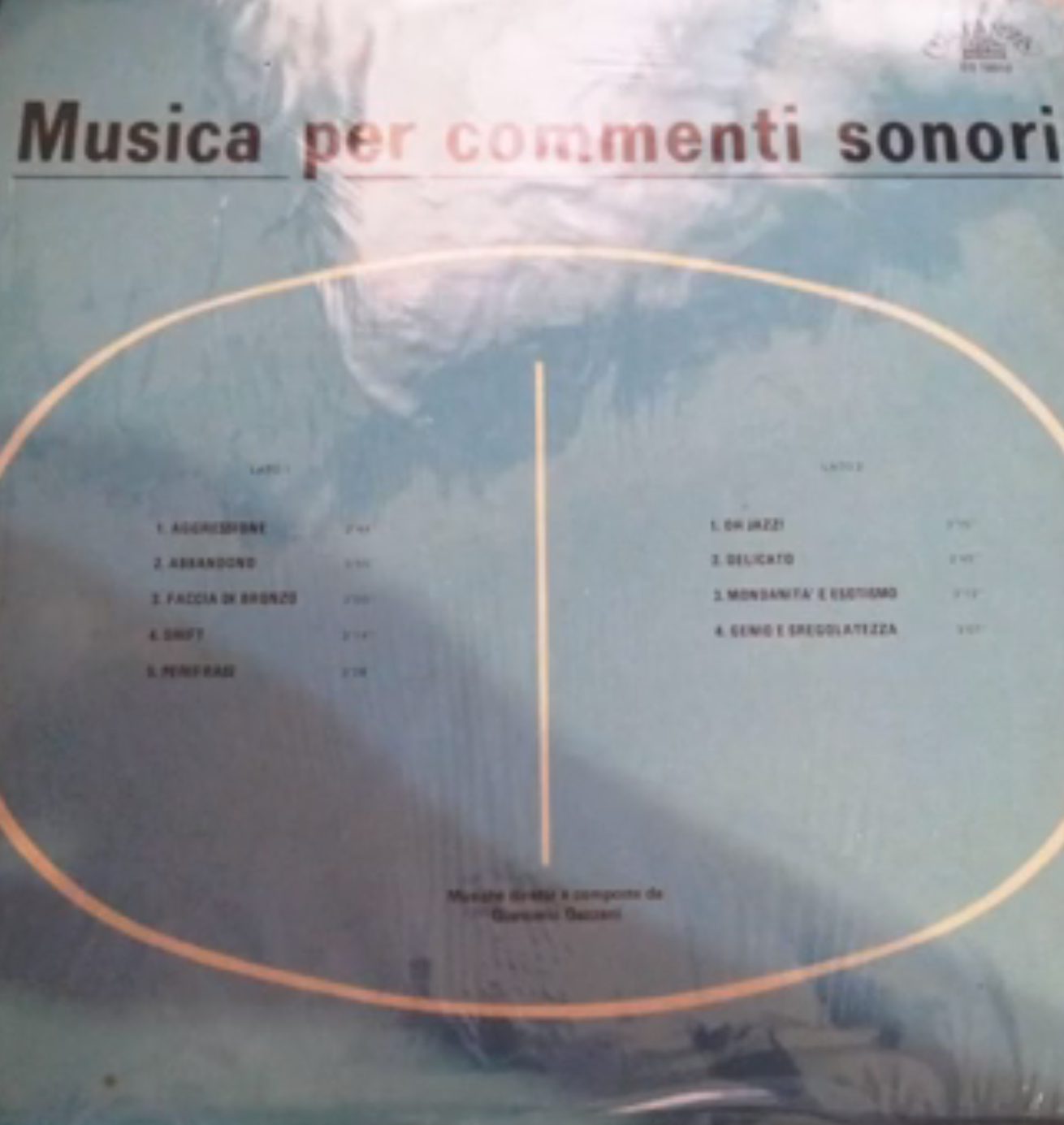 “Perifrasi,” “Aggressione,” “Faccia di bronzo,” “Shift,” and “Genio e sregolatezza” from Giancarlo Gazzani’s Musica per commenti sonori (1974), featuring Sandro Brugnolini and Stefano Torossi, a nine-track Costanza Records LP (CO 10010) withdrawn immediately after release and never reissued in any format: